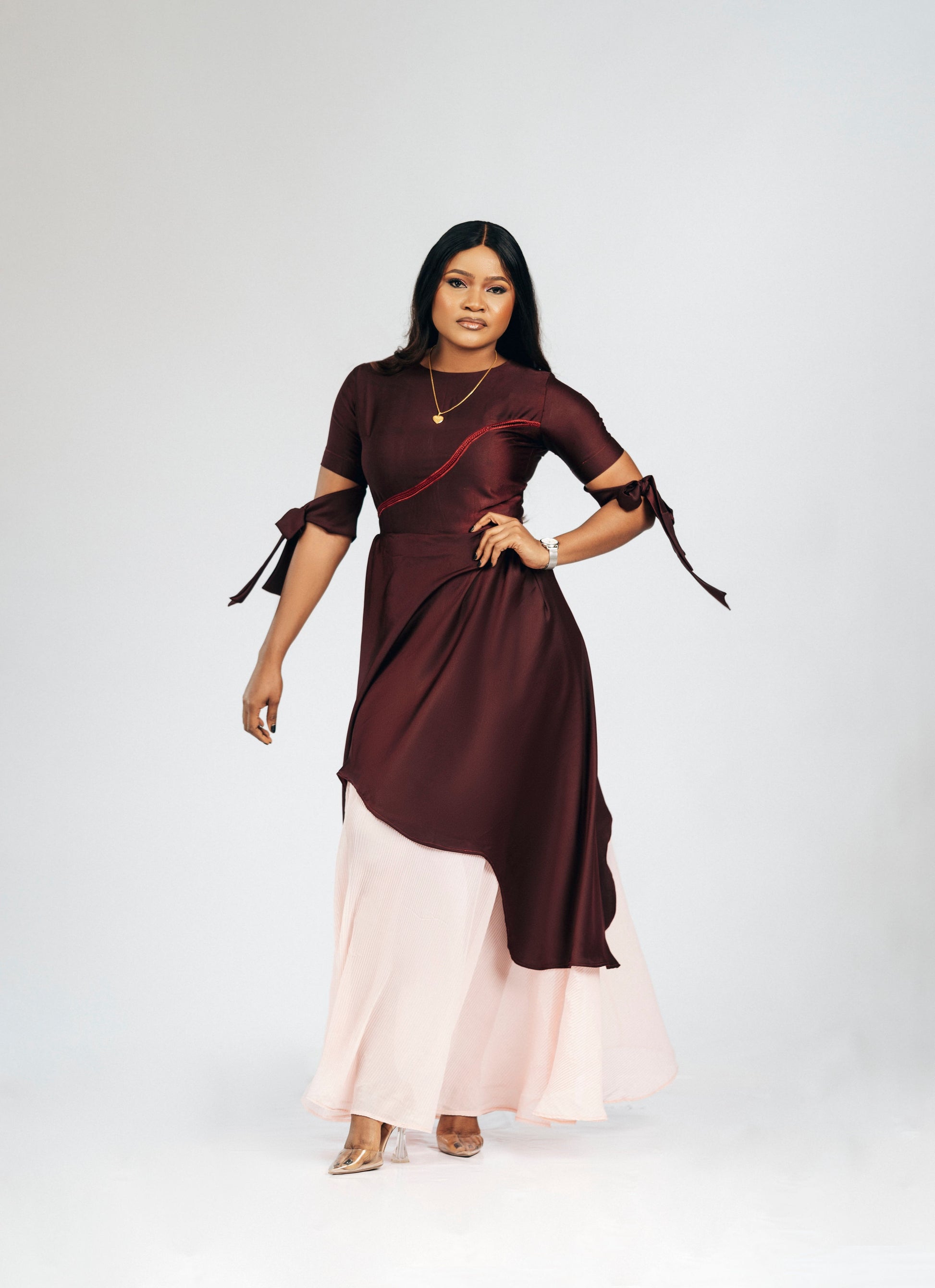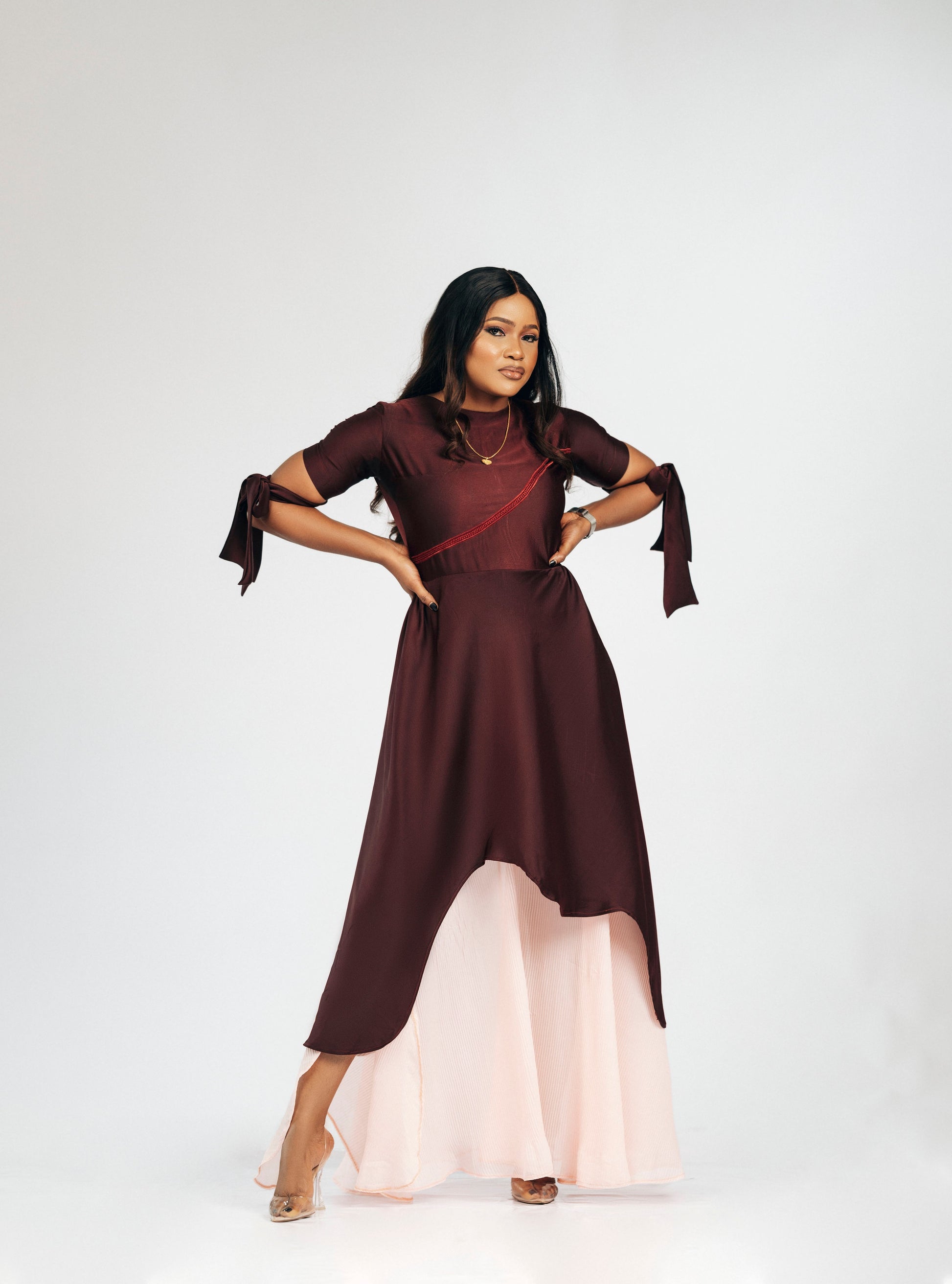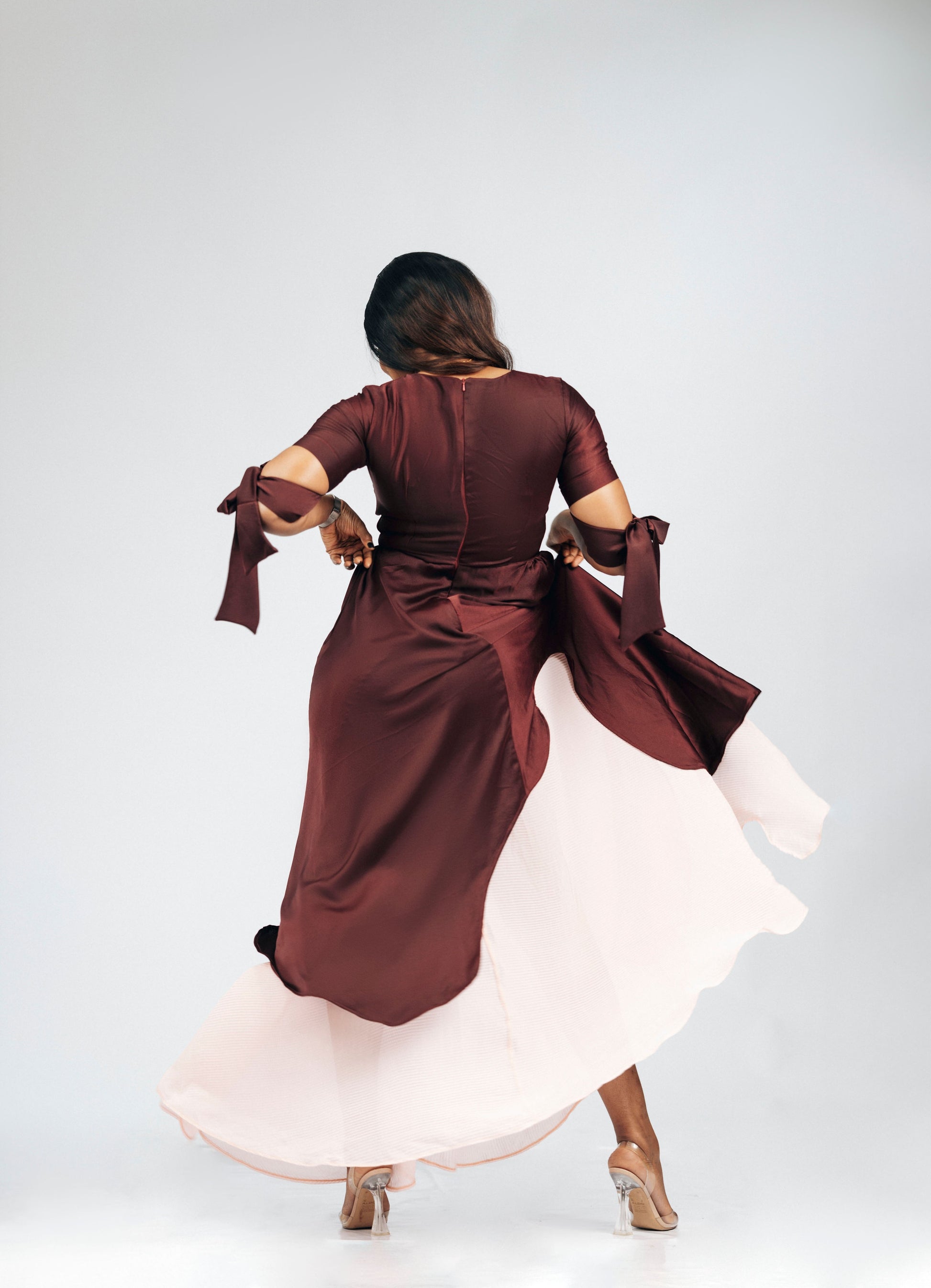 The Mariposa dress is made out of medium-weight silk crepe and chiffon accordion fabric. One of it's most distinctive features is the asymmetric peplum skirt, a modern take on the classic peplum silhouette. It also features beautiful intricate embroidery detailing across the bodice.